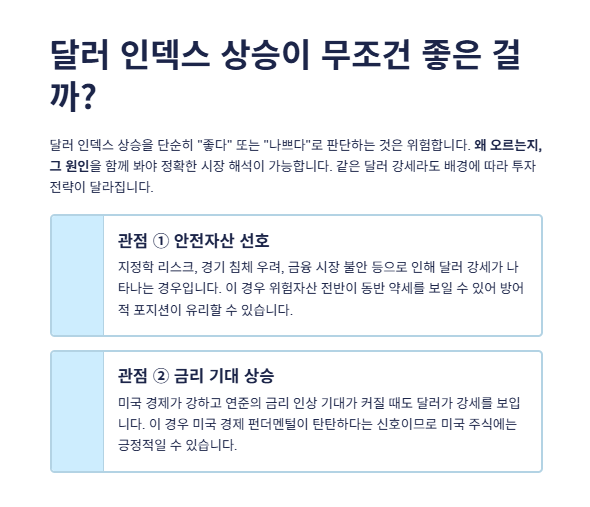 이 부분은 단순히 좋다, 나쁘다로 볼 수 없습니다. 달러 인덱스 상승의 배경이 중요합니다.