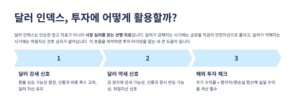 투자자 입장에서 달러 인덱스는 단순 참고 지표가 아니라 시장 심리를 읽는 선행 지표 역할을 합니다. 예를 들어 달러가 강해지는 시기에는 글로벌 자금이 안전자산으로 몰리는 경우가 많습니다. 이때 신흥국 증시나 위험자산은 상대적으로 약세를 보일 수 있습니다.